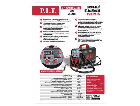 Инвертор сварочный ПОЛУАВТОМАТ P.I.T. 145А,ПВ-60,MMA 1.6-4мм, 4,0кВт, MIG 0,8-1мм,1/1